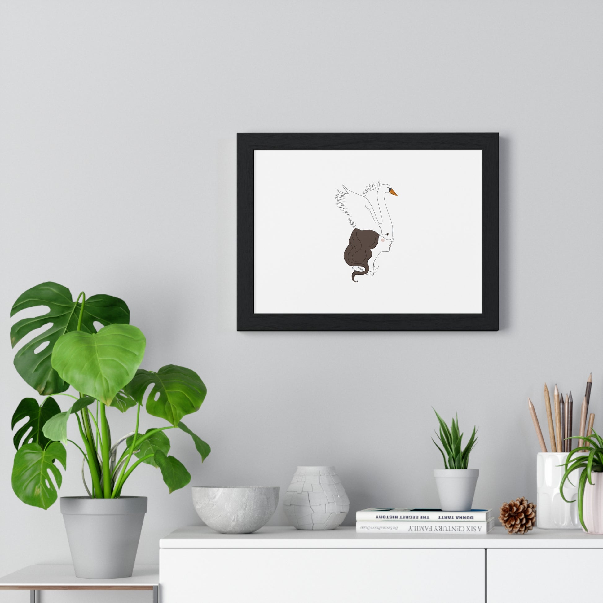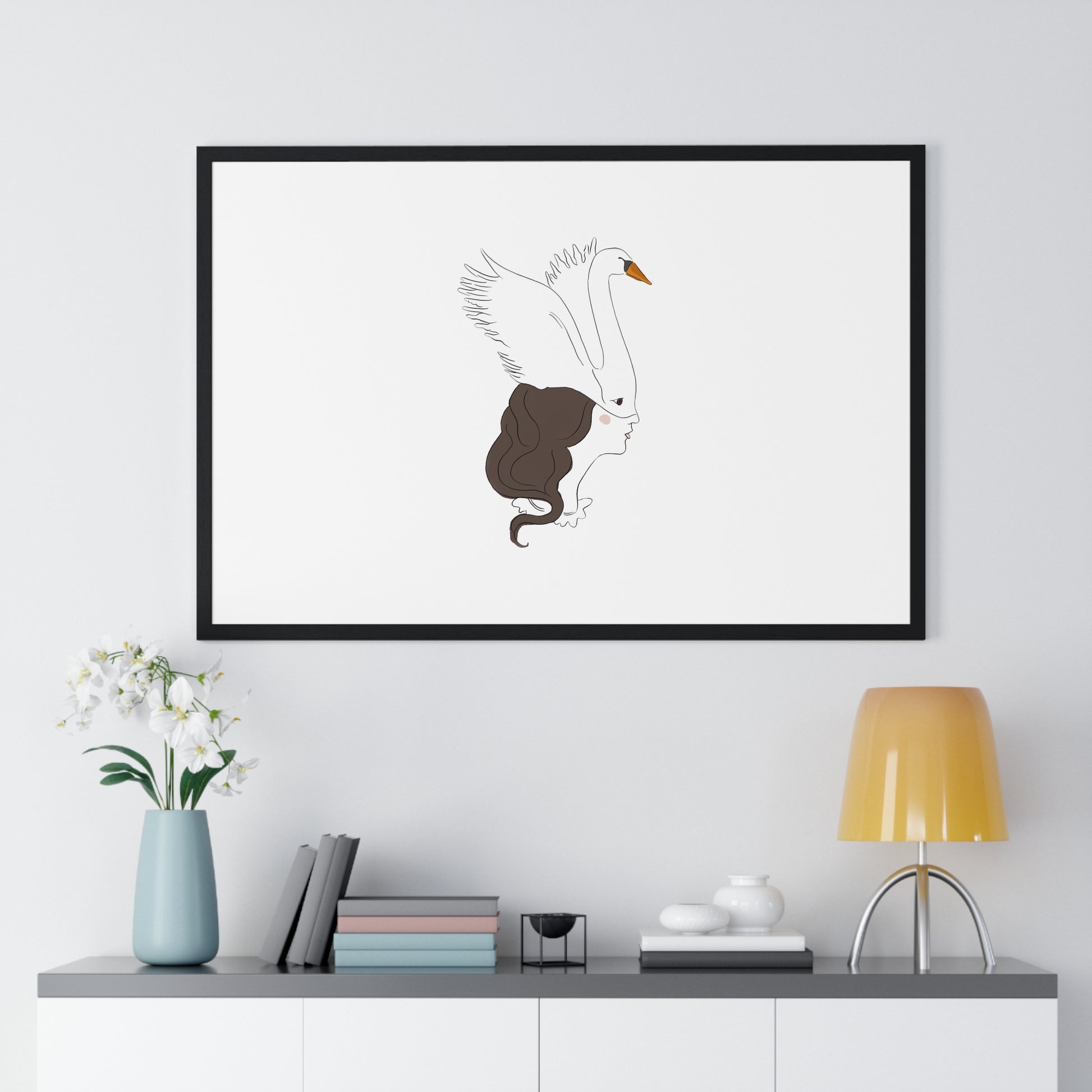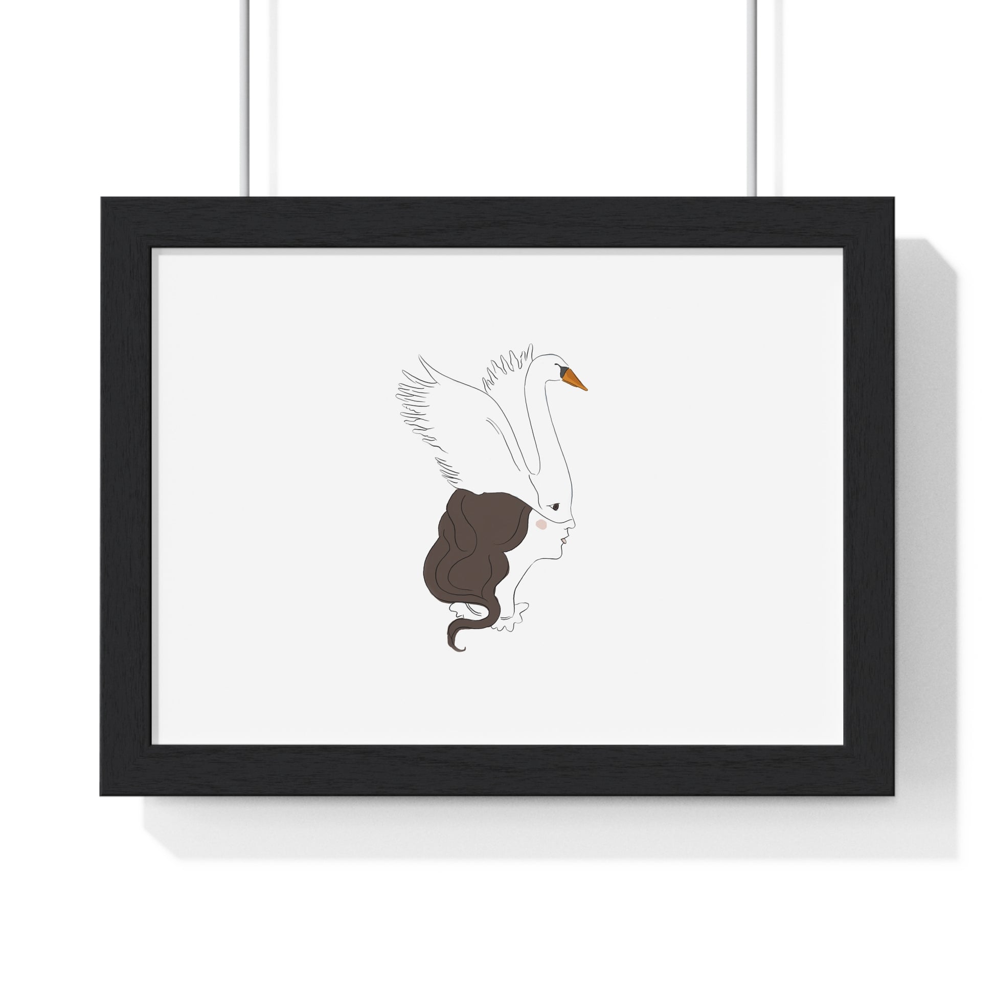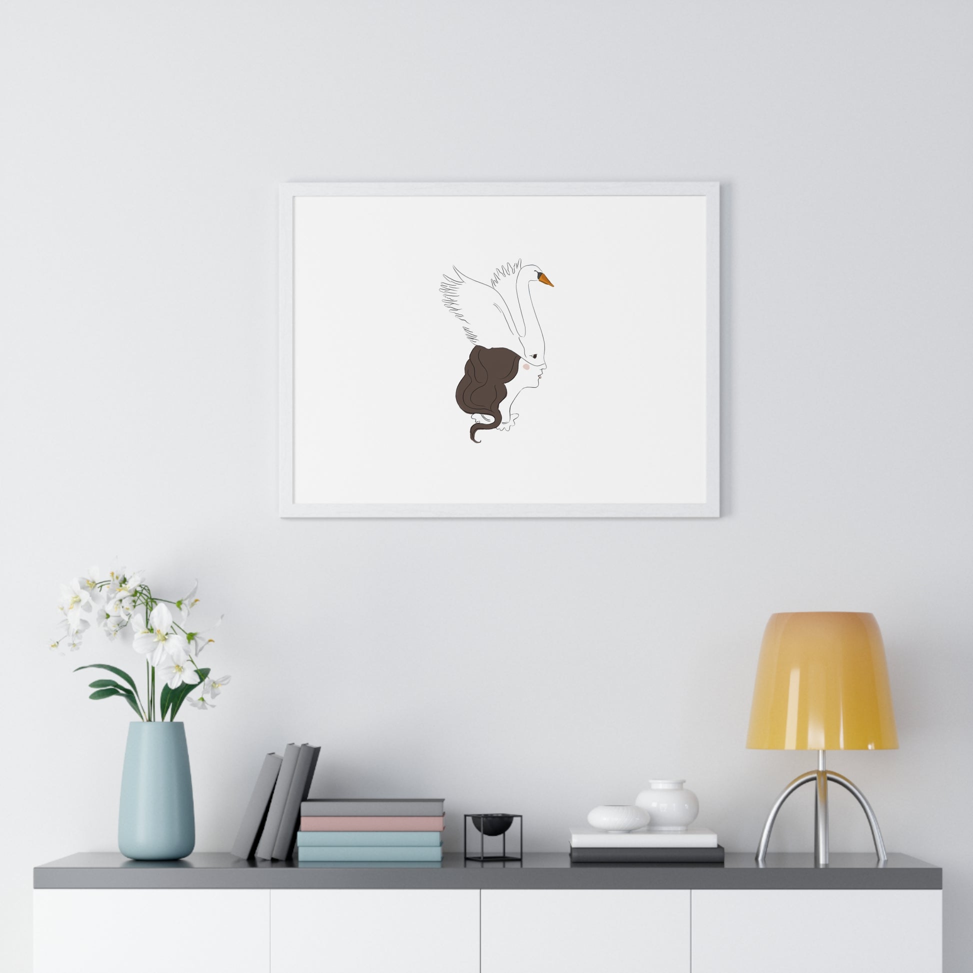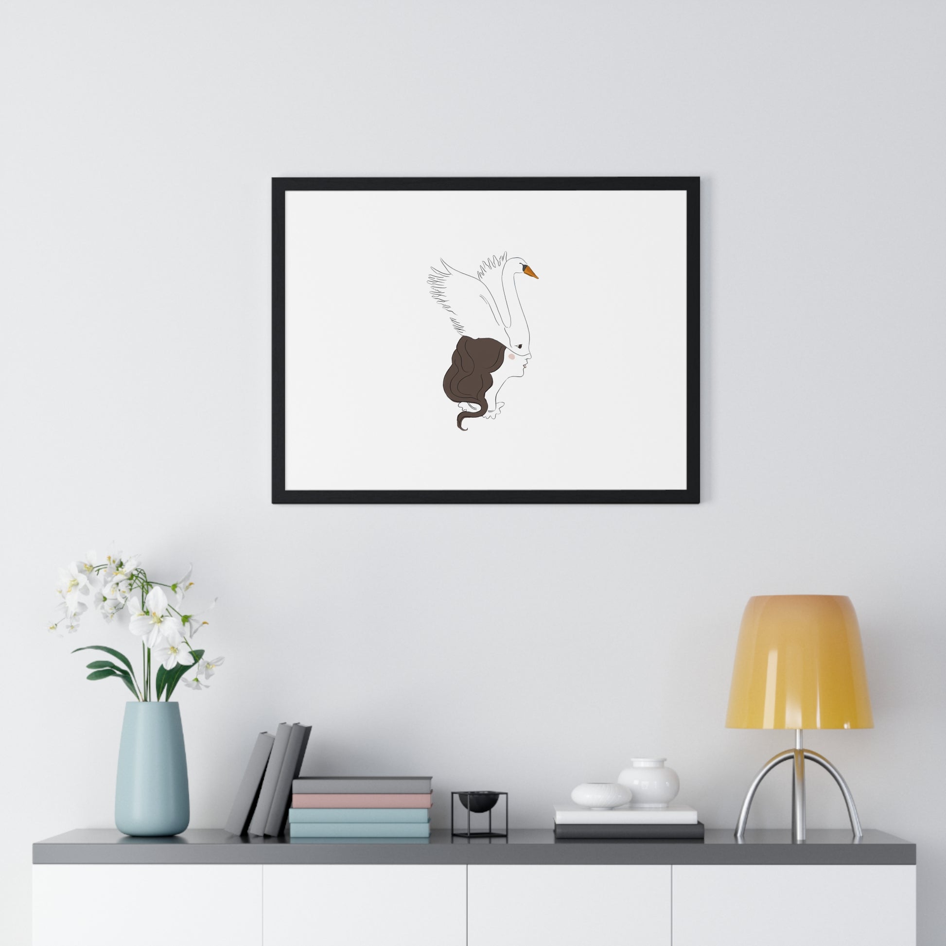 This horizontal framed poster pairs minimalist line art with a quiet, poetic mood — a swan gently merging with a woman's profile, rendered on matte museum-grade paper. The airy composition and restrained palette bring calm and refined personality to a living room, bedroom, or studio wall. Mounted in a slim wooden frame (black or white) with a plexiglass front, it arrives ready to hang so the artwork can immediately settle into your space and start a conversation about grace, transformation, and stillness.