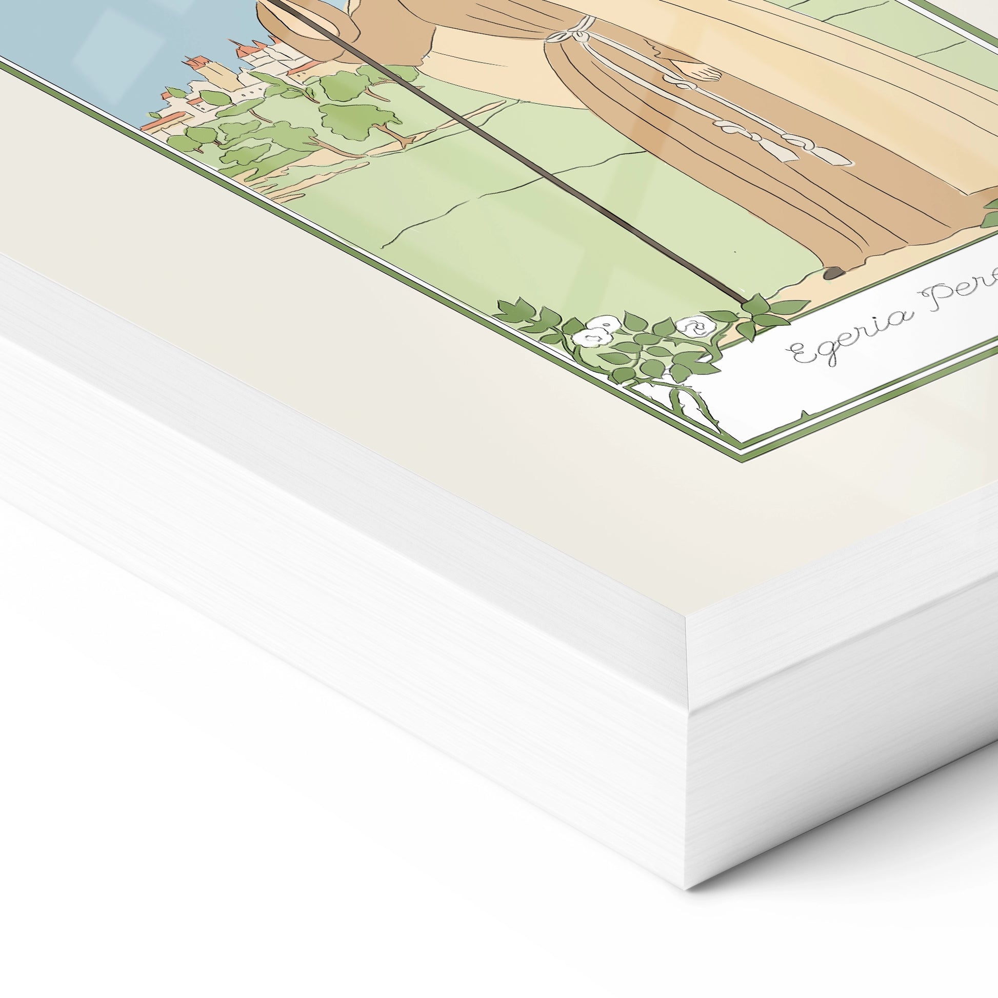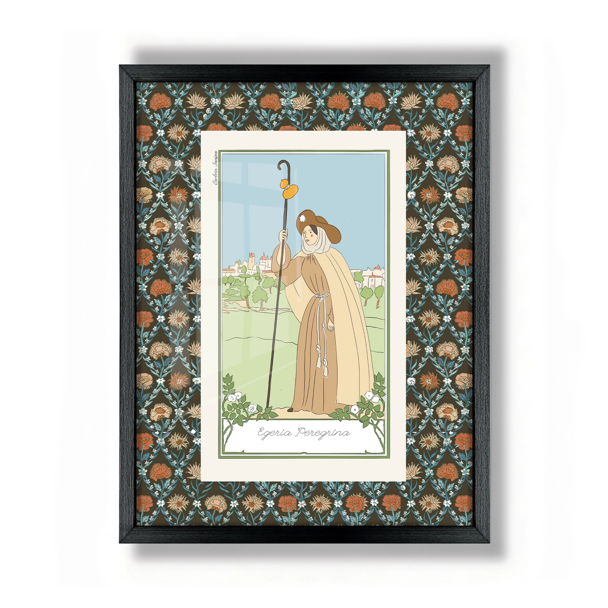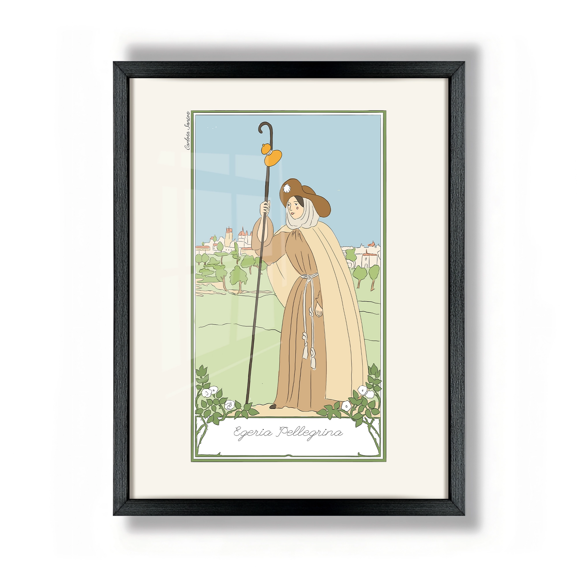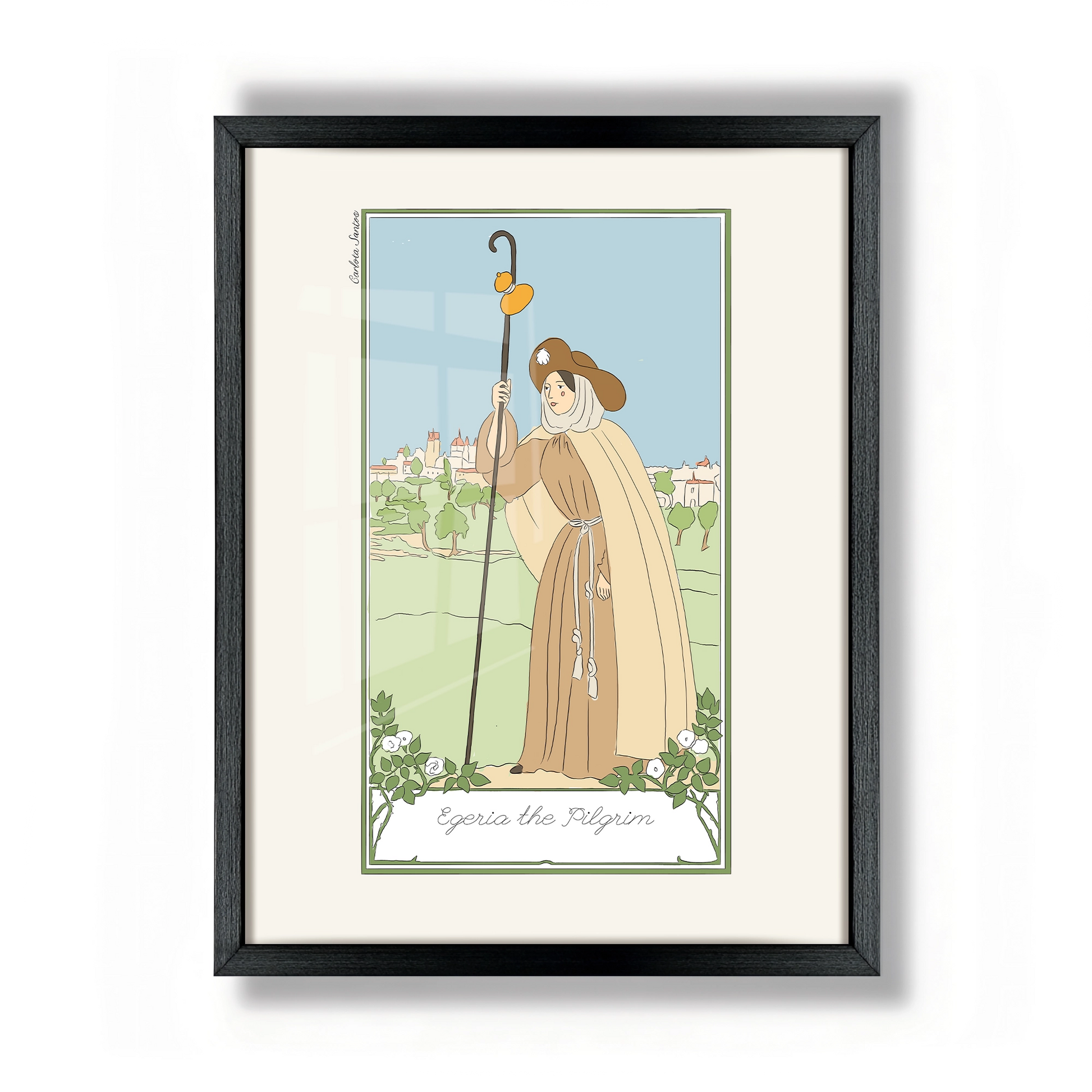 Catholic wall art ready to hang. Featuring "Egeria the Pilgrim" from her illustrated book "Santas" or Women Saints (2026), a project devoted to the visual reinterpretation of female sanctity, Spanish artist Carlota Santos reimagines religious and classical imagery through a modern illustrative approach.